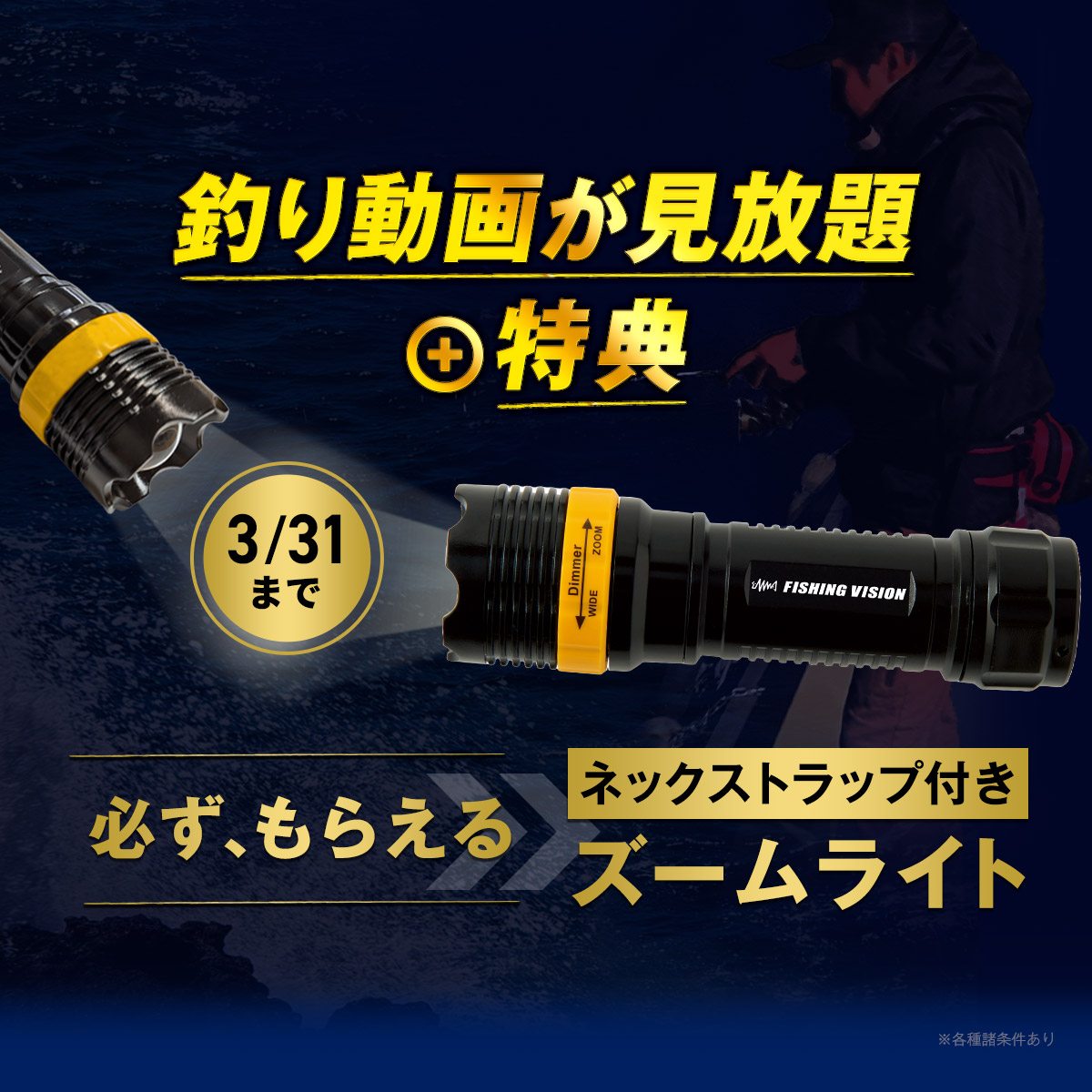 キャンペーン期間中に釣りビジョン倶楽部(VOD)に新規登録・応募し、定額制月額有料サービスを1回以上ご利用いただくと、もれなく「釣りビジョン・オリジナルグッズ」をプレゼント!