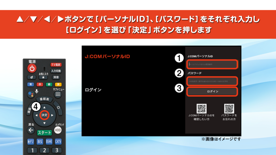 J:COM LINKで視聴する際にはログイン時に「J:COMパーソナルID」・「パスワード」の入力が必要です。(J:COMパーソナルIDについてはこちらからご確認ください。https://cs.myjcom.jp/knowledgeDetail?an=000001577)